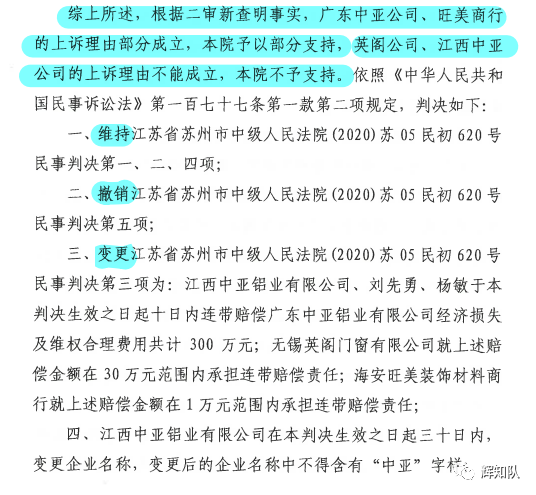 日前,辉知队代理的广东中亚铝业诉海安旺美装饰材料商行、无锡英阁门窗有限公司、江西中亚铝业有限公司、刘先勇、杨敏侵害商标权及不正当竞争纠纷一案取得最新进展。因不服苏州中院一审判决,辉知队代理原告广东中亚公司提起上诉,理由成功获得二审法院支持,判决结果如下: